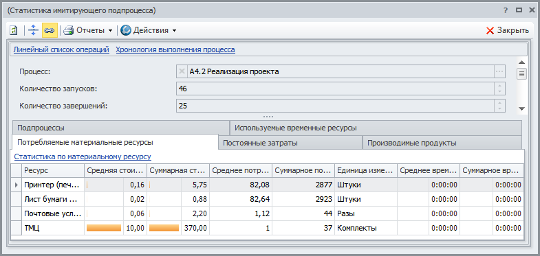Проанализировать эти параметры имитирующих ресурсов можно при помощи вкладки Используемые материальные ресурсы (Рис.3) окна Статистика имитирующего процесса или Статистика имитирующего подпроцесса (Рис.1).