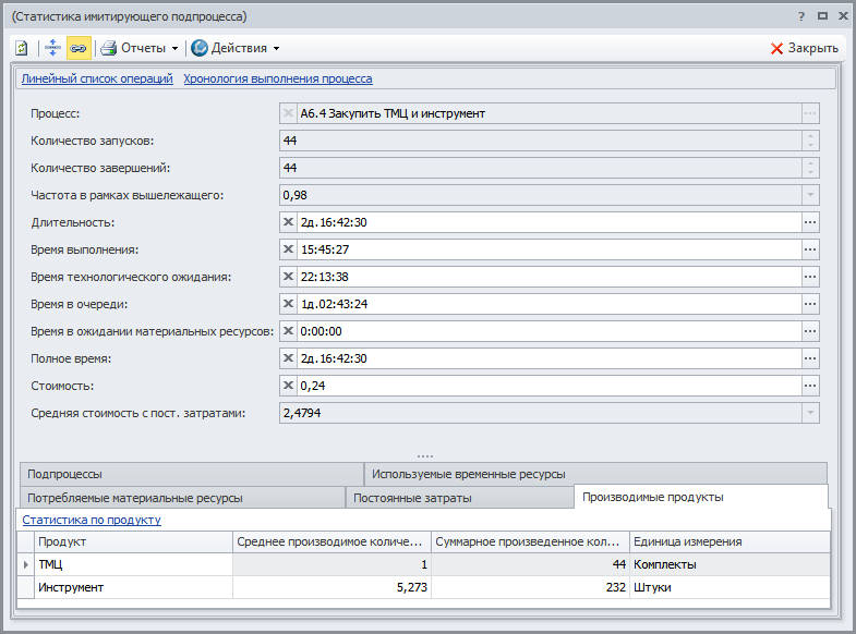 | Средняя стоимость использования | Средняя стоимость потребления имитирующего материального ресурса при выполнении экземпляра имитирующего процесса. Рассчитывается в валюте имитации. Параметр рассчитывается по формуле: |