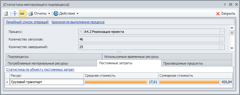 Выделив на вкладке Постоянные затраты интересующий имитирующий ресурс и нажав гиперссылку Статистика по объекту постоянных затрат, можно перейти к окну Статистика объекта постоянных затрат для анализа статистики по выделенному имитирующему ресурсу (см. главу Анализ результатов, сгруппированных относительно имитирующих ресурсов типа "Постоянные затраты").