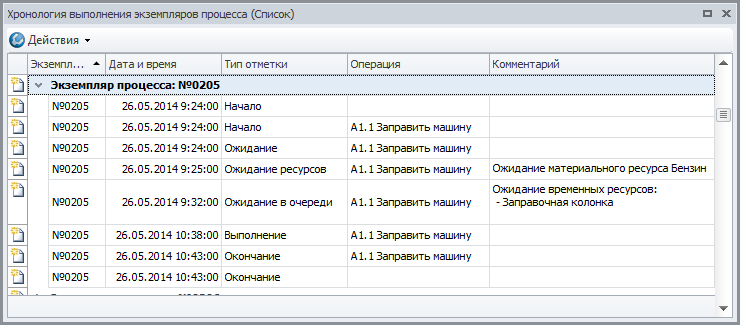 Проанализировать каждый шаг выполнения каждого экземпляра имитирующего процесса можно, нажав гиперссылку Хронология выполнения процесса в окне Статистика имитирующего процесса или Статистика имитирующего подпроцесса (Рис.1). В открывшемся окне (Рис.7) представлен перечень экземпляров имитирующего процесса и хронология выполнения каждого экземпляра.