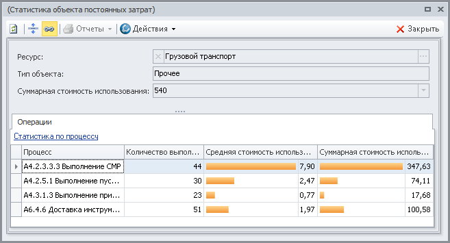 Вкладка Операции позволяет анализировать параметры имитирующих операций, при выполнении экземпляров которых использовался имитирующий ресурс типа "Постоянные затраты".