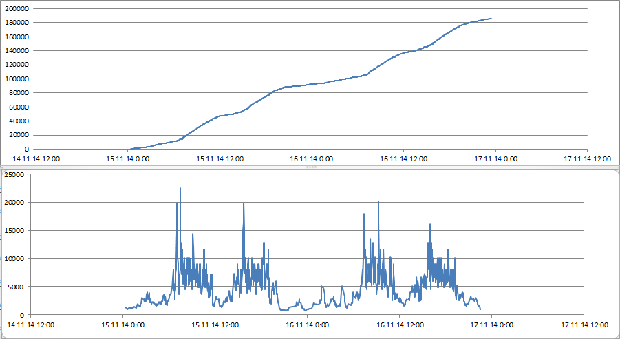 Например, предположим, что аналитик изучает, каким образом изменялись значения экземпляра глобальной переменной "Прибыль". Если он выгрузит данные об изменении значений экземпляра этой переменной в Microsoft Excel, то сможет построить, например, график зависимости полученной прибыли от времени и график зависимости скорости ее получения от времени (Рис.3).