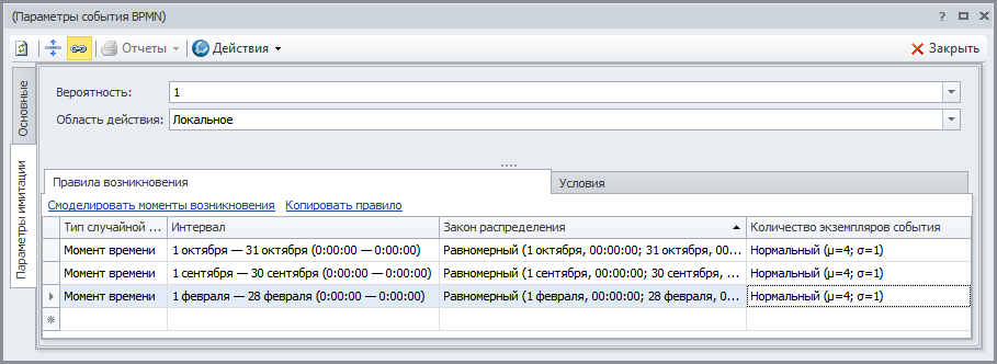 Смоделировав правила возникновения экземпляров события, можно сымитировать их возникновение (Рис.4). Это необходимо для того, чтобы проверить корректность заданных условий, сравнить желаемое поведение системы с реальным. Для этого в Окне свойств объекта справочника "События" (вкладка Параметры имитации → вкладка Правила возникновения) необходимо нажать гиперссылку Смоделировать моменты возникновения.