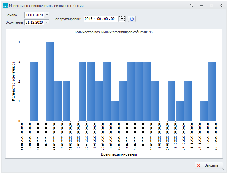 На Рис.4 представлен результат тестовой генерации экземпляров имитирующего события. Начало имитационного периода: 01.01.2020, завершение: 31.12.2020. Один столбец показывает, сколько экземпляров имитирующего события возникает за 15 дней (значение параметра "Шаг группировки"). При этом всего за указанный период возникло 45 экземпляров имитирующего события. В этой форме допустимо менять значения параметров "Начало", "Окончание", "Шаг группировки". Эта возможность позволяет представить отчет в удобной для аналитика форме с нужным ему масштабом отображения данных.