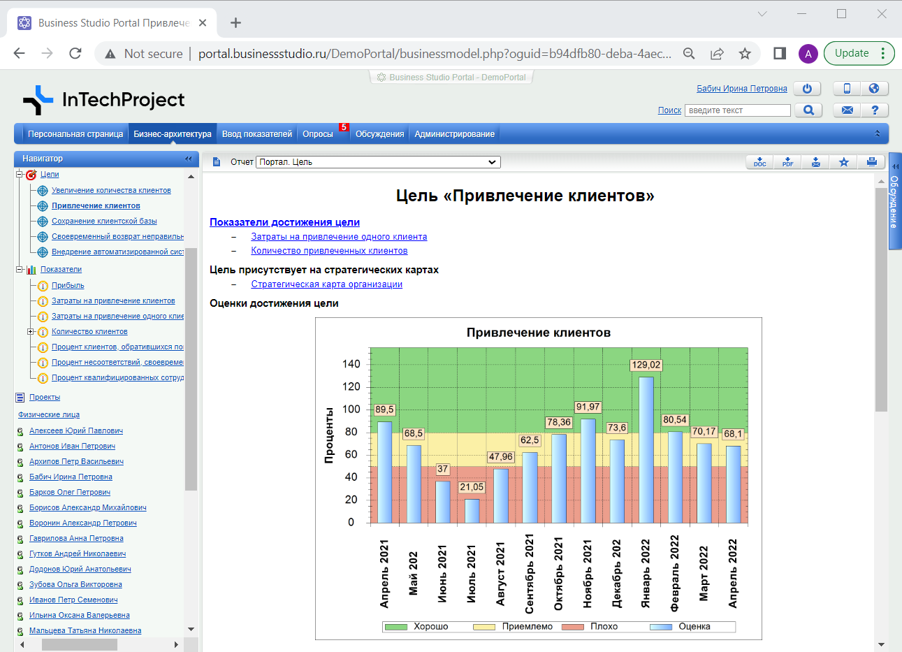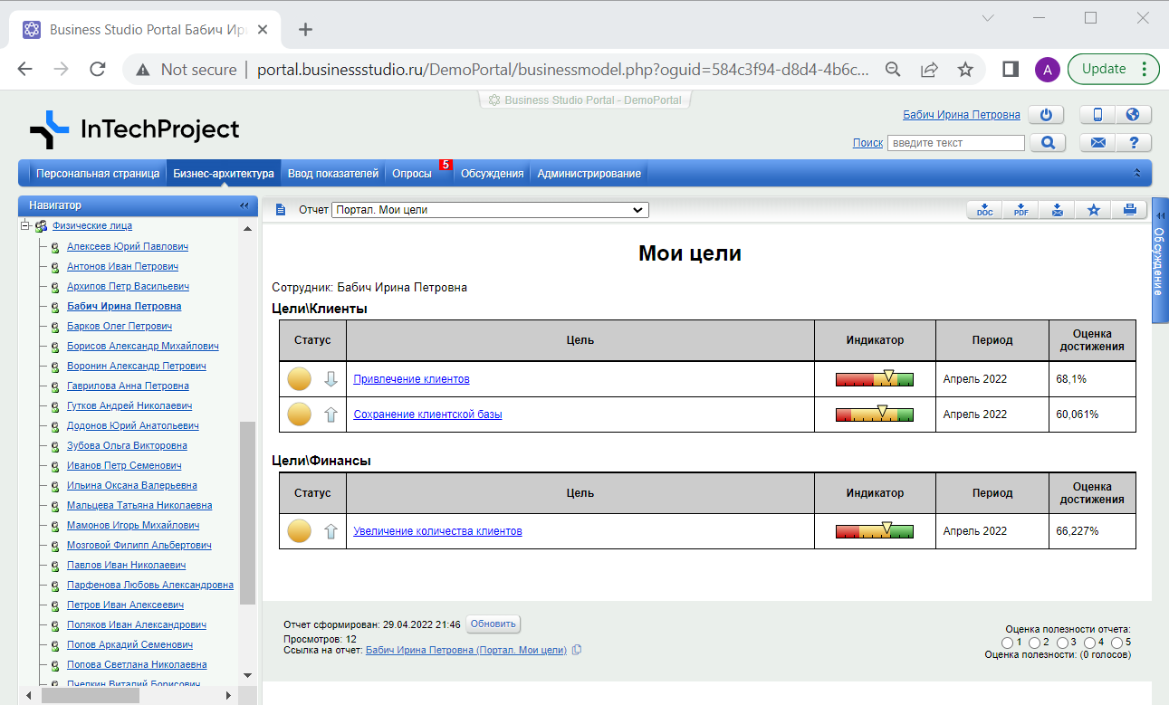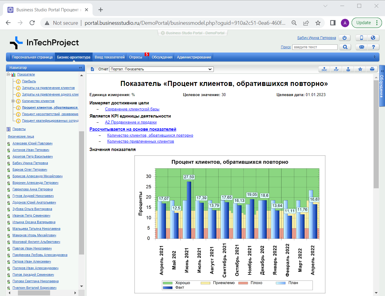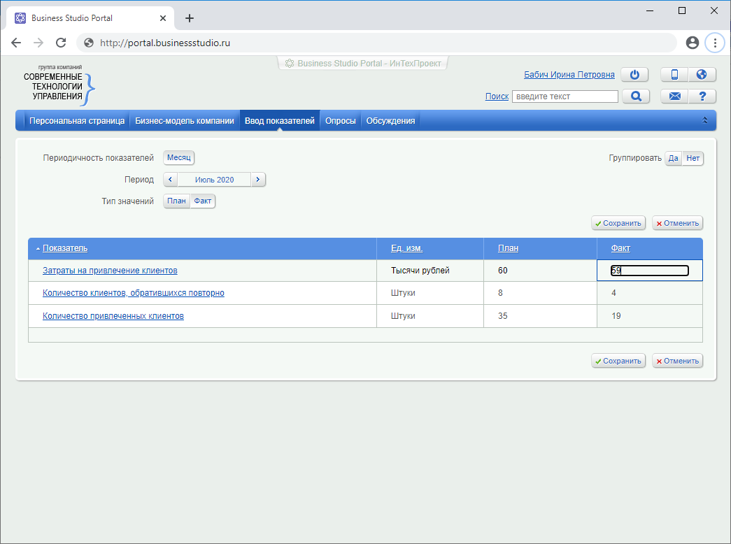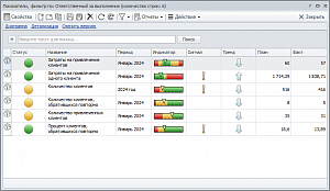 Контроль показателей осуществляется с помощью Business Studio Portal. На портале ответственные лица наглядно видят текущее состояние каждого из ключевых показателей деятельности компании с помощью цветового сигнализатора «Статус».