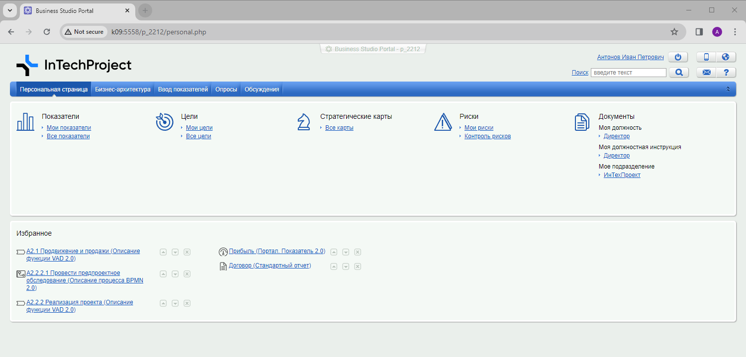 После авторизации сотрудник попадает на свою Персональную страницу, на которой представлена нужная для работы информация и документы: «Описание должности», «Должностная инструкция», «Описание подразделения» и другие.