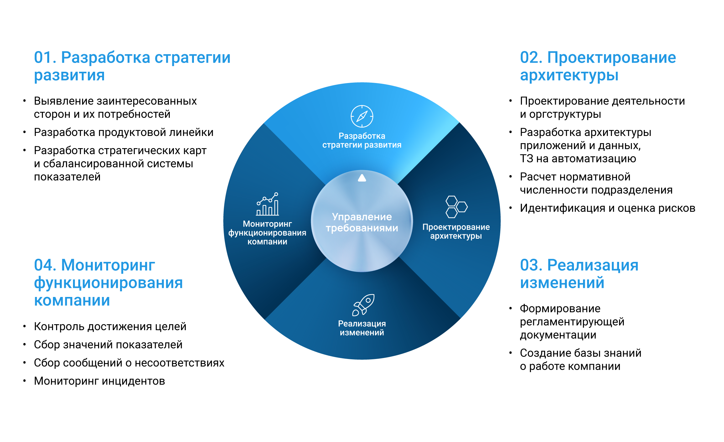 Возможности Business Studio обеспечивают полную поддержку цикла организационного развития: от разработки стратегии и проектирования бизнес-архитектуры до изменения компании и мониторинга ее функционирования.